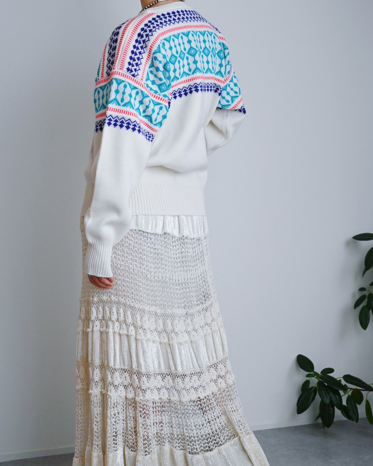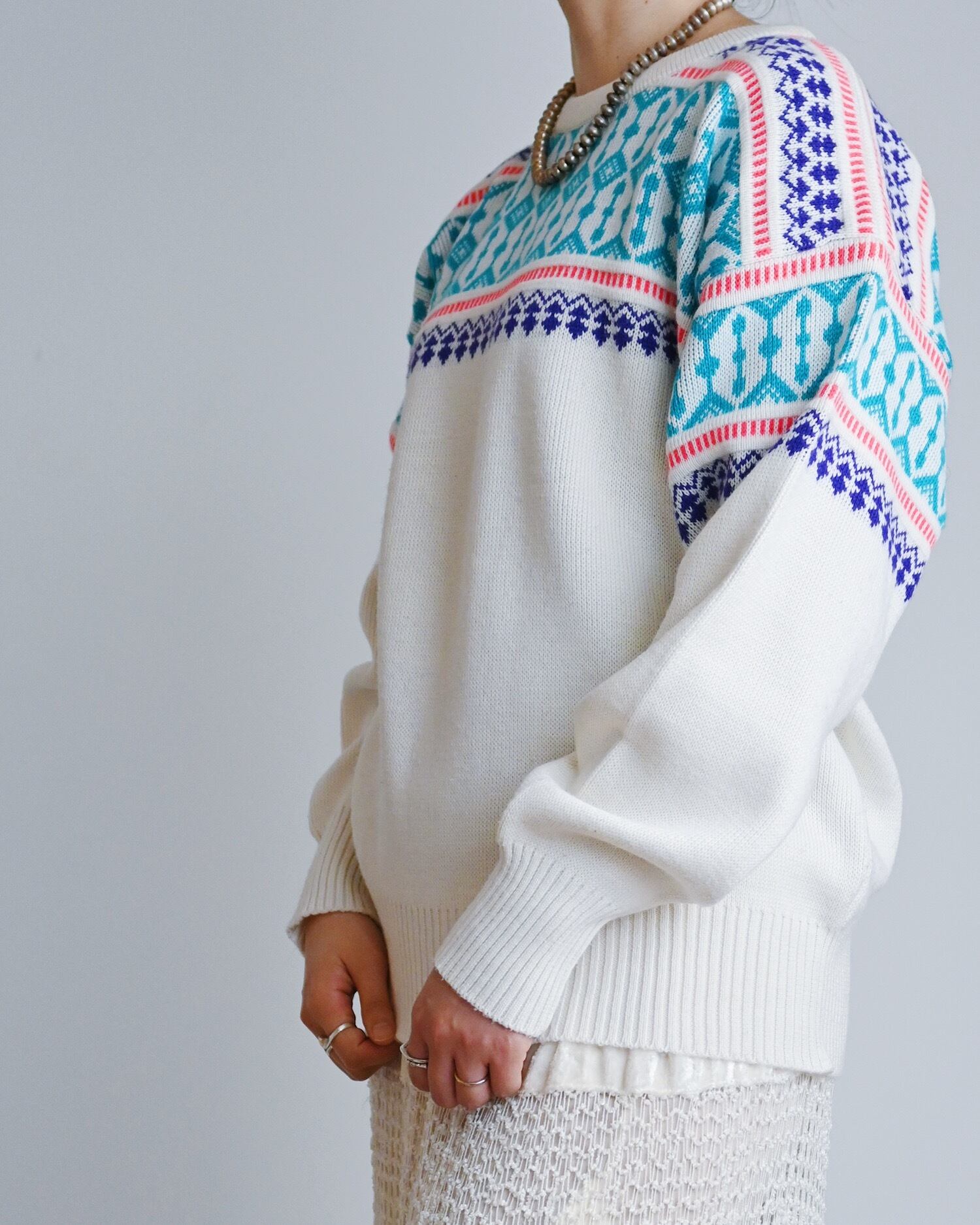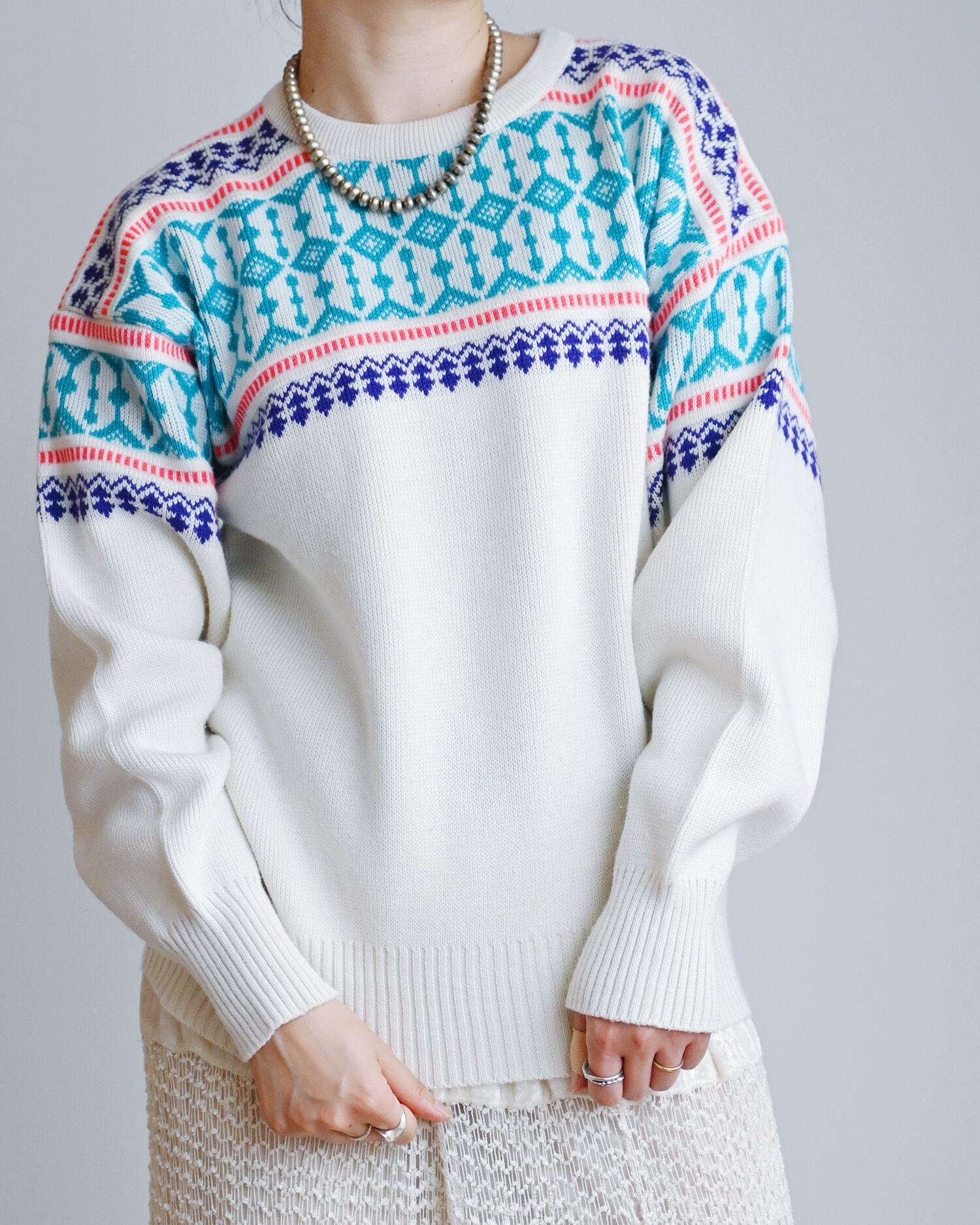 ブルーやパープル、ピンクなどのカラーリングが楽しいノルディックニット。分厚くないのでインナーとして合わせやすく、柄がスタイリングのポイントになってくれます。