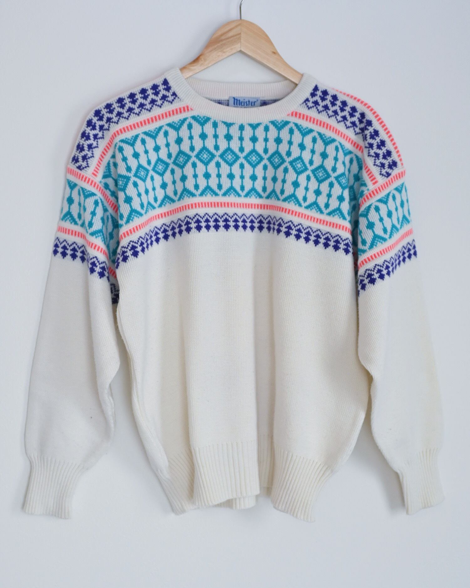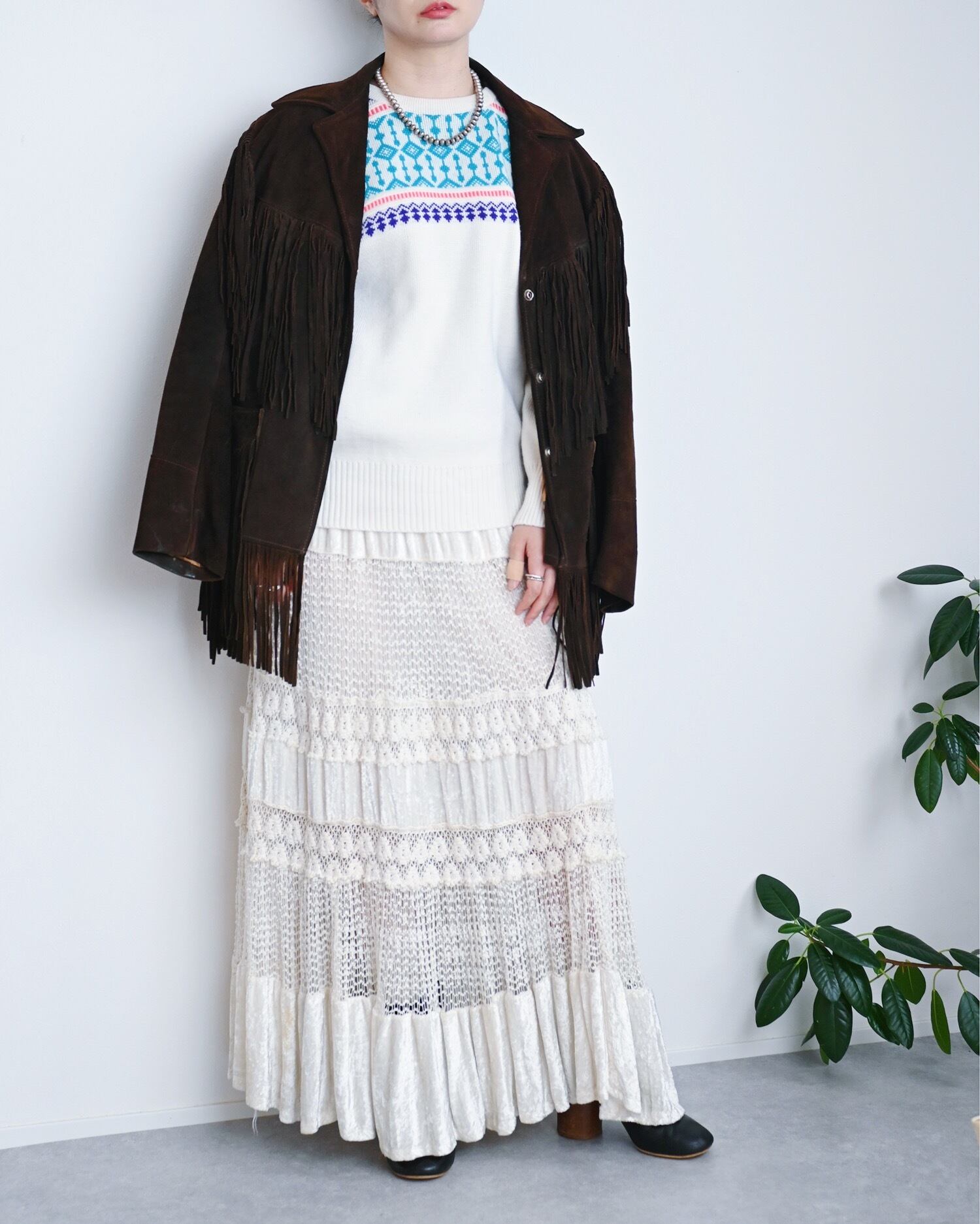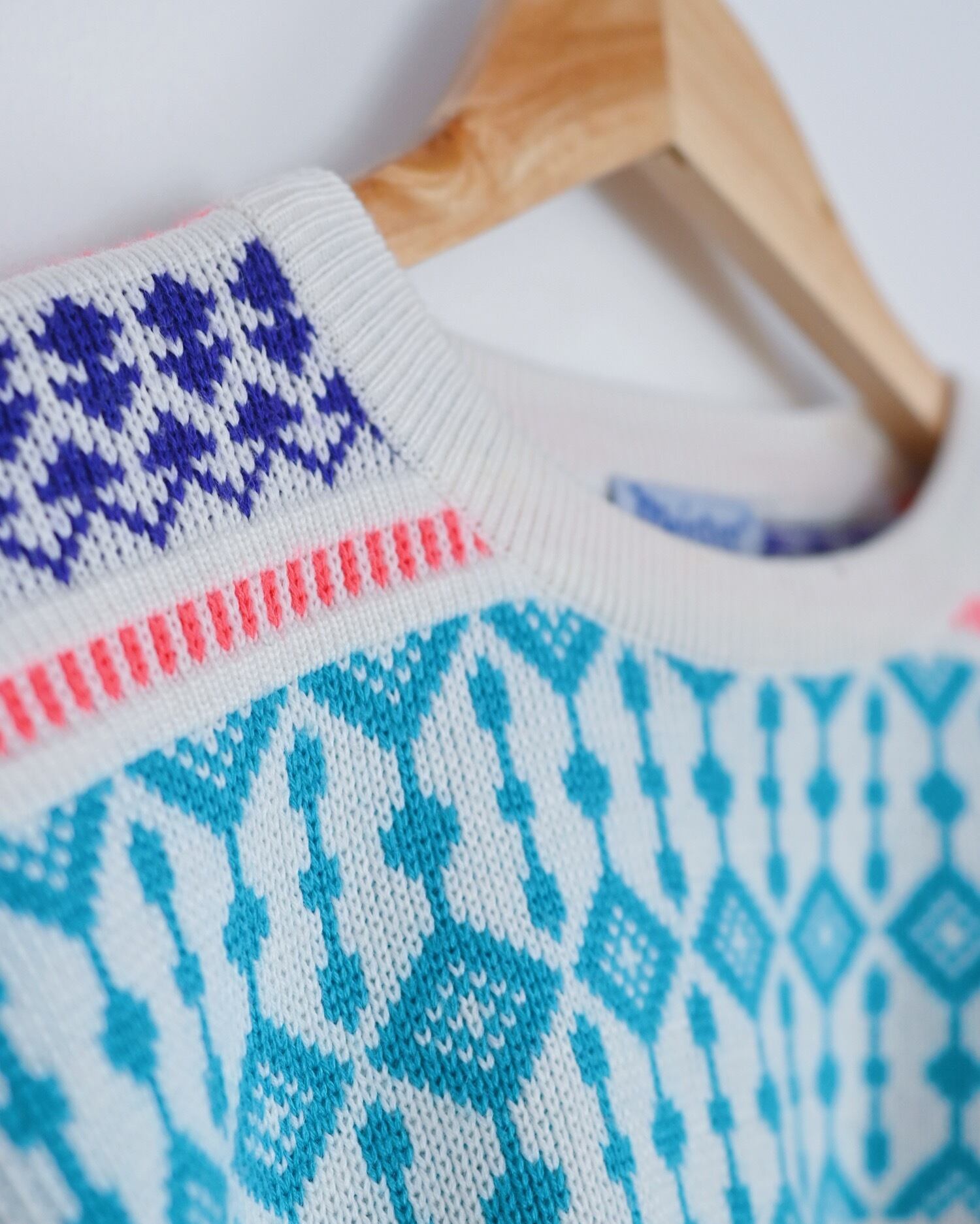 ブルーやパープル、ピンクなどのカラーリングが楽しいノルディックニット。分厚くないのでインナーとして合わせやすく、柄がスタイリングのポイントになってくれます。