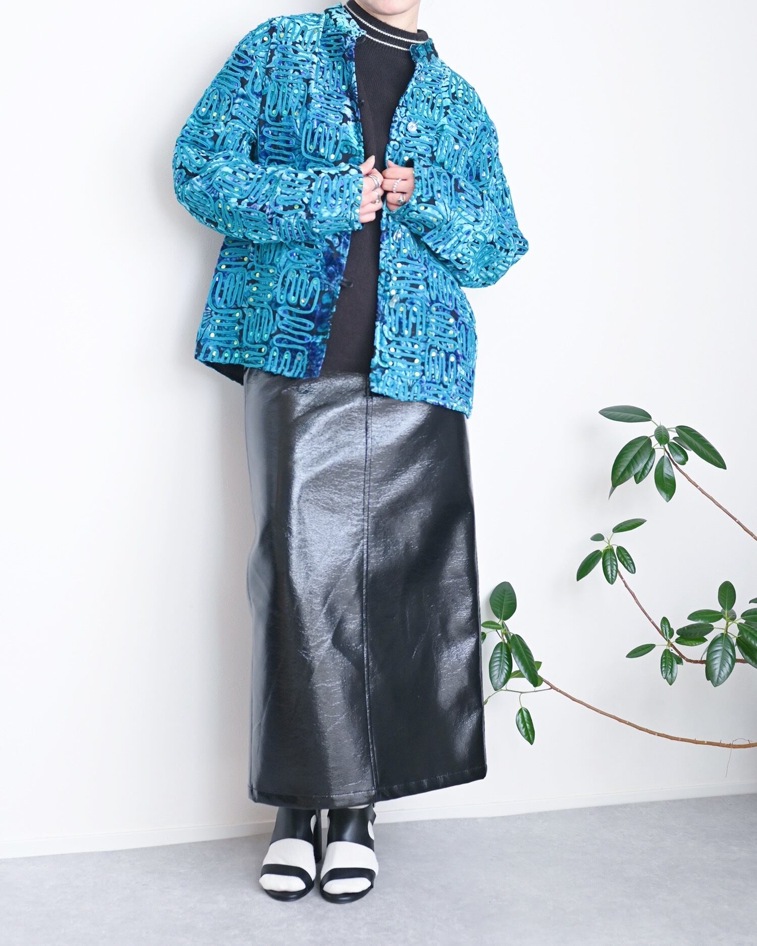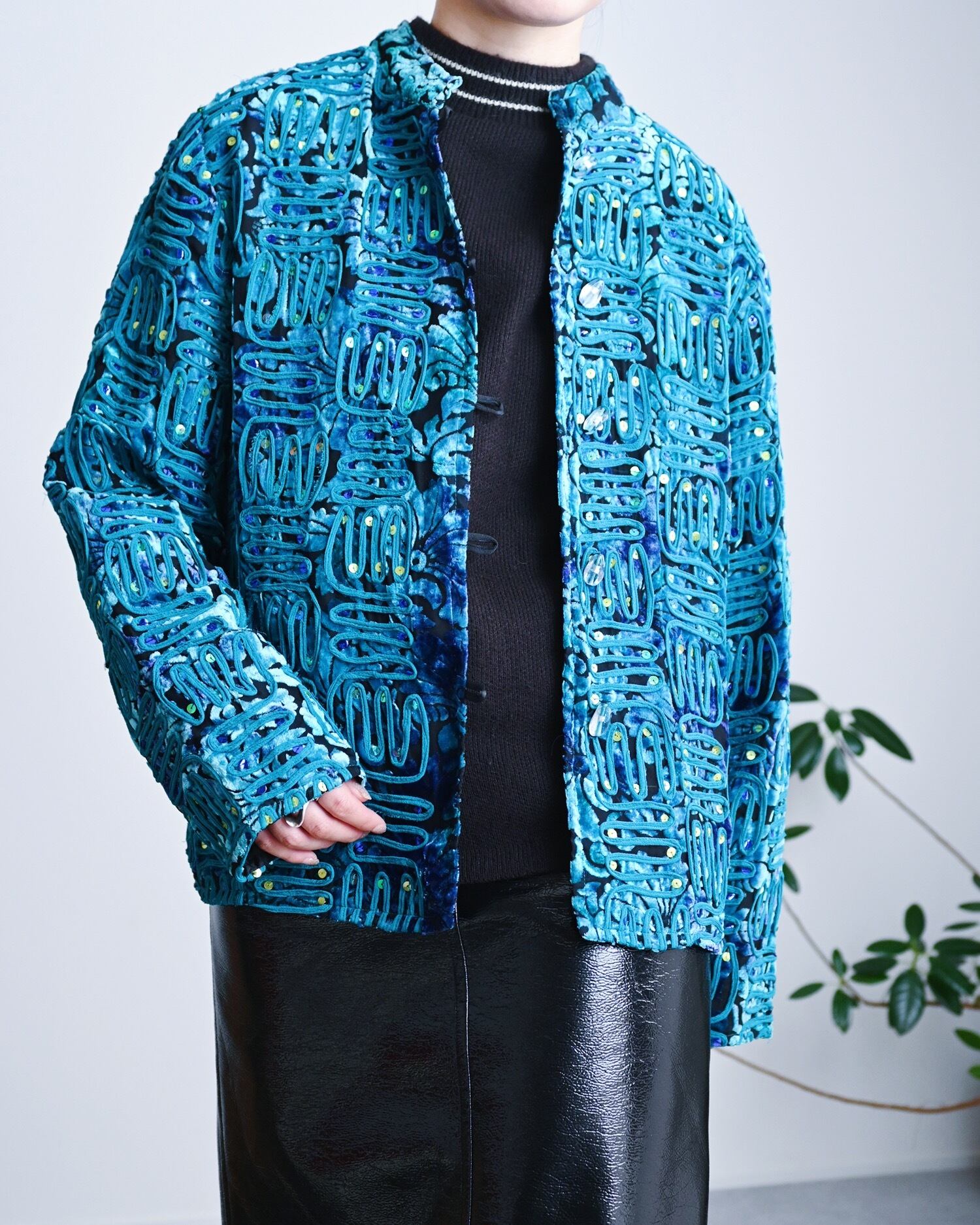柄ベロア生地にコード刺繍やスパンコールを散りばめたスペシャルなスタンドカラージャケット。